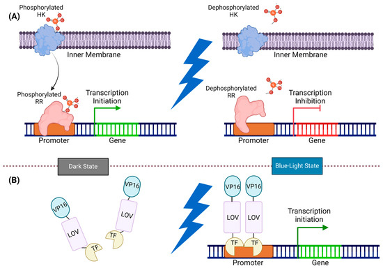 TCSs comprise a sensor histidine kinase (SHK) and a response regulator (RR). SHKs are frequently multidomain signaling proteins organized in a modular architecture that undergo an allosteric transition between two signaling states: active with autophosphorylation and phosphotransferase activity, and inactive with phosphatase activity [74,75]. Through exposure to light, these systems trigger a change in the cofactor-bound HK, leading to kinase activation or deactivation adjustment. This signal is then transmitted via a phosphate group to the corresponding intracellular receptor, which regulates gene expression at the appropriate promoter site (Figure 4) [76].