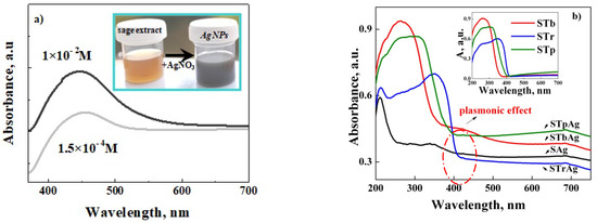 The formation of biosynthesized AgNPs was demonstrated by the appearance of a surface plasmon resonance (SPR) band at around 450 nm (Figure 2a). UV-Vis spectra were recorded for AgNPs obtained in conditions of different concentrations of AgNO3 solution (1 × 10−2 M and 1.5 × 10−4 M and 24 h of solution aging).