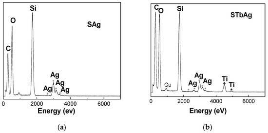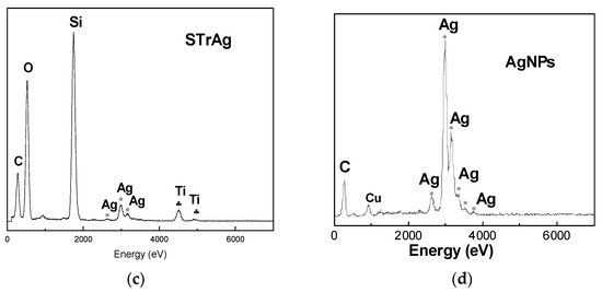 TEM image (Figure S1) indicated that TiO2 is not observed as a separate phase in STb sample, which is in agreement with previous studies [54,55]. The commercial TiO2 particles (rutile and P25 Degussa) present in the STr and STp supports were dispersed among the particles of SBA-15. These TiO2 materials were already characterized [52,56]. It was observed that these titanium oxides contain mixtures of particles with variable and much larger sizes (50–250 nm) with spherical (P25) or ovoid (rutile) morphology. A TEM image of the STrAg sample area (Figure S2) shows the presence of large particles next to those typical of SBA-15, which can be attributed to TiO2. The presence of Ti was evidenced in all SBA-15 supports modified with TiO2 (Figure 5 and Figure S4). EDX has also confirmed the presence of Ag species in all the samples.