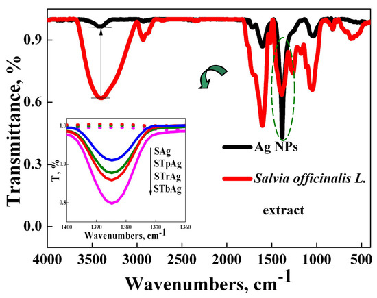 Looking comparatively at the FTIR spectrum of the alcoholic sage extract and that of the biosynthesized silver nanoparticles, the preservation of the main vibration bands of the sage extract was observed, but with a lower intensity, which suggests the consumption of biomolecules during the biosynthesis of silver nanoparticles. This observation is in agreement with other reports in the literature [26] and suggests the importance of the bioactive compounds present in the used extract, acting as reducing and capping agents, in order to obtain stable silver nanoparticles. The sharp peak recorded at 1387 cm−1 for silver nanoparticles can be assigned to the unreacted Ag precursor (AgNO3) (Figure S3) and also to C-H bonding [57].