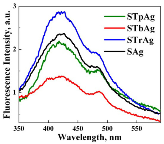 The photoluminescence (PL) spectra of hybrid samples are shown in Figure 7. Excited at a wavelength of 320 nm, the samples present four major PL emission peaks at around 408, 420, 435 and 484 nm. The emission bands recorded at 408 and 435 nm are most likely due to oxygen vacancies and neutral oxygen vacancy defects’ triplet to ground transition, while the emission band recorded at 484 nm is due to surface defects [58]. The emission peaks are determined both by the phenomena that occur at the level of TiO2 supported on SBA-15 and by the presence of polyphenols that have a high electron density that most likely contribute to the increase in photoluminescence intensity. The slightest photoluminescent intensity recorded for the STbAg sample means the lowest recombination capacity of the photogenerated charges (e−/h+), thus suggesting the greatest number of existing defects in its structure. They were most likely created due to the synthesis method, the sample being thermally treated at 550 °C after impregnation with titanium butoxide.