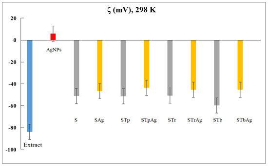 Figure 8 comparatively presents the zeta potential (ζ) of the plant extract, AgNPs and supports (S, STp, STr, and STb) in the absence and in the presence of AgNPs.