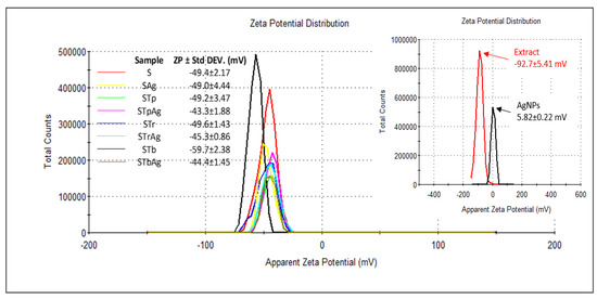Zeta potential values and distribution curves of S, STp, STr and STb nanoemulsions in the absence and presence of AgNPs at 298 K (inset panel is for extract and AgNPs). For the extract, AgNPs and each type of support/support–AgNPs, zeta potential values are the average result for five measurements and the standard deviation.
