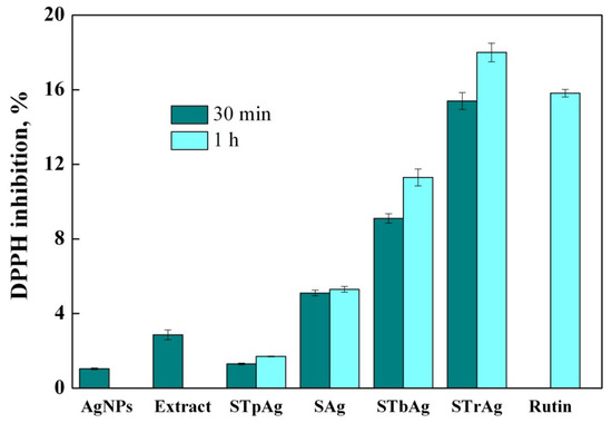 An evaluation of antioxidant activity with the 2,2-diphenyl-1-picrylhydrazyl (DPPH) radical scavenging assay (Figure 10) proved that STrAg and STbAg had the highest scavenging activity, whereas AgNPs and STpAg showed low DPPH inhibition. The higher antioxidant activity of STb and STr supports is a result of the interaction between Ag and anatase, highly dispersed on the silica surface [54], and of rutile activity, respectively. The antioxidant activity of silica-coated TiO2 was previously reported [60]. The increase in antioxidant activity with time for the supported AgNPs is a result of the effect of mass transfer into the support. The increase in antioxidant activity is due to the synergistic activities of the sage extract, AgNPs and support (especially supported TiO2 species). The antioxidant capacity of STrAg and STbAg can be attributed to the redox potential of phenolic compounds (flavonoids and phenolic acids) from sage extract which act as reducing agents.