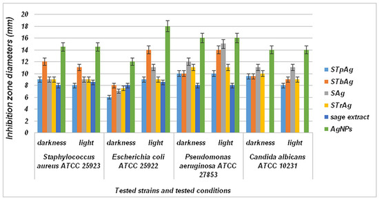 The presence in the synthesized nanohybrid systems of Ag+ ions (from AgNO3 precursor) that can bind via the polyphenolic compounds of the sage extract to the surface of the silver nanoparticles formed during biosynthesis cannot be excluded, as reported in the case of using sodium citrate as reducing agent [33]. Thus, the possible release of Ag+ ions bound to the AgNPs surface could be associated with the inhibitory effect of all synthesized materials, evidenced even in dark conditions (Figure 10, Table 2). Silver ion release was investigated for a Ag/TiO2/Ag/a-TiO2 nanocomposite film [65]. The results evidenced a long saturation time for silver ions due to their protection by a very thin titania layer. Therefore, the protection of Ag nanoparticles and their immobilization is a solution for increasing the durability of the obtained materials. Here, AgNPs are covered with a stabilizing layer of sage extract components and immobilized on a support. Obviously, the presence of bioactive compounds from sage extract that act as reducing and capping agents also makes a real contribution to the inhibitory effect of hybrid nanostructures toward all tested strains in darkness, clearly proving the antibacterial effect of the sage extract itself (Figure 11). Also, various other properties of inorganic nanoparticles such as size distribution, morphology and surface charge influence the biological activity of the samples [53,66,67].