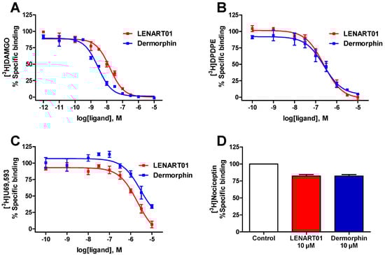 In vitro binding of LENART01 and dermorphin to human opioid receptors determined in radioligand competition binding assays. (A) Concentration-dependent inhibition of [3H]DAMGO binding to CHO-hMOR cell membranes. (B) Concentration-dependent inhibition of [3H]DPDPE binding to CHO-hDOR cell membranes. (C) Concentration-dependent inhibition of [3H]U69,593 binding to CHO-hKOR cell membranes. (D) Specific binding to human NOP receptor using [3H]nociceptin and CHO-hNOP cell membranes. Values represent means ± SEM (n = 3 independent experiments).