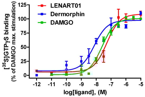 As shown in Figure 3, LENART01 increased [35S]GTPγS binding to the human MOR in a concentration-dependent manner, demonstrating full efficacy compared to DAMGO and dermorphin. In this functional assay, LENAR01 displayed potent MOR agonist activity, with an ED50 value only two-fold compared to DAMGO, and a five-fold reduced potency compared to dermorphin (Table 2). The in vitro agonist profile of dermorphin to the human MOR established in our study is in good agreement with the functional data reported earlier [,].