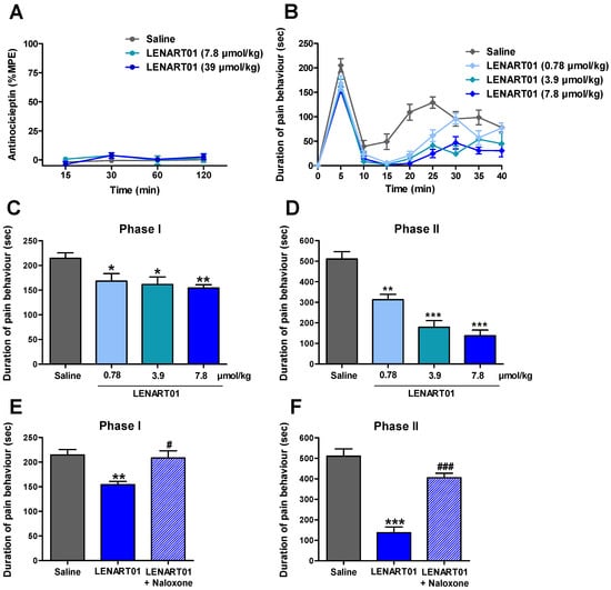 Effect of LENART01 in models of acute nociceptive pain and inflammatory pain after s.c. administration in mice. (A) Radiant heat tail-flick test. Groups of mice received s.c. saline or different doses of LENART01 (3.9 and 7.8 µmol/kg), and tail-flick latencies were measured before and after drug administration at different times. Antinociceptive response is expressed as % of maximum possible effect (%MPE). Values represent means ± SEM (n = 5 mice per group). (B–F) Formalin test. Groups of mice received s.c. saline (control) or different doses of LENART01 (0.78, 3.9 and 7.8 µmol/kg) before an intraplantar injection of the formalin solution in right hind paw. Duration of pain behavior was monitored for 40 min, determined as amount of time (in seconds, sec) each animal spent licking, biting, lifting and flinching formalin-injected paw. Time course of pain behavior in formalin test on mice treated with LENART01 (B). Dose-dependent antinociceptive effect of LENART01 during nociceptive Phase I (C) and inflammatory Phase II (D) of the formalin test. (E,F) Opioid antagonism by naloxone on antinociceptive effect of LENART01 during Phase I and Phase II. Mice were s.c. pre-treated with naloxone (1 mg/kg), 15 min before s.c. administration of LENART01 (7.8 µmol/kg). Values represent means ± SEM (n = 6–8 mice per group). * p < 0.05, ** p < 0.01, *** p < 0.001 vs. saline group; # p < 0.01, ### p < 0.001 vs. LENART01-treated group; one-way ANOVA with Tukey’s post hoc test.