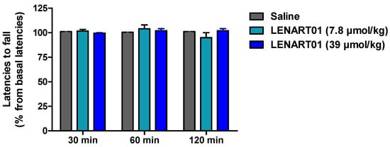 Effect of LENART01 in the rotarod test after s.c. administration in mice. Groups of mice received s.c. saline (control) or different doses of LENART01 (7.8 and 39 µmol/kg), and latencies to fall from the rotarod were measured before and after drug administration at different times. Latencies to fall are expressed as percentage (%) from baseline. Values represent means ± SEM (n = 5 mice per group).