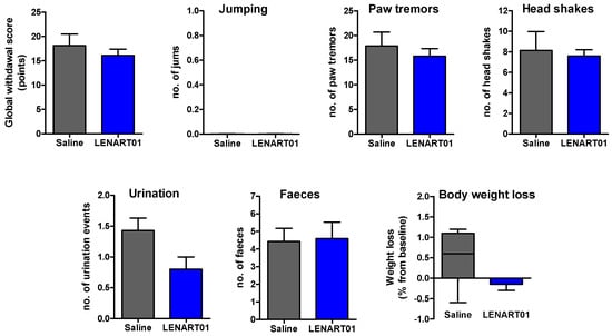 The long-term use of traditional opioids is associated with physical dependence []. Such dependence can be visualized in opioid-dependent mice by injecting naloxone and the occurrence of withdrawal symptoms, i.e., jumps, paw tremors, head shakes and diarrhea [,]. To evaluate the behavioral effects of LENAR01 in mice after chronic s.c. treatment, the potential for physical dependence was determined using naloxone-precipitated withdrawal syndrome as described previously []. Mice were treated twice daily over a 5-day period with a dose of 7.8 µmol/kg of LENAR01 or saline (control). Mice were administered LENART01 in a dose showed to be effective in the formalin test, corresponding to 5-fold the antinociceptive ED50 dose (Table 3).