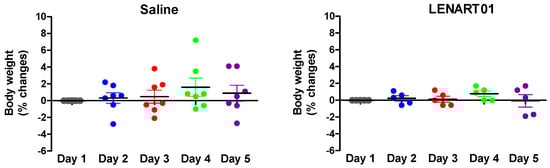 Weight changes in mice after chronic treatment with LENART01. Groups of mice received s.c. saline (control) or 7.8 mg/kg of LENART01 twice daily for 5 days, and changes in body weight were measured daily and are expressed as percentage (%) change from day 1. Values represent means ± SEM (n = 5–7 mice per group).