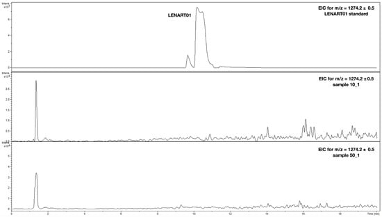 BBB permeability of LENART01. Extracted ion chromatograms (EICs) calculated for [M–H] = 1274.2 ± 0.5 m/z for standard hybrid peptide LENART01 (top) and brain homogenate samples from mice that were s.c. treated with 7.8 µmol/kg (middle) and 39 µmol/kg (bottom) of LENART01.
