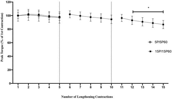 Fifteen LC but not five LC significantly decreased peak torque. Peak torque dropped approximately 3% following 5 LC but was reduced by approximately 13% following 15 LC. Torque was significantly reduced at the 12th LC and thereafter relative to the first contraction. * p < 0.001. n = 10/group. Values are expressed as mean ± SEM.