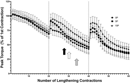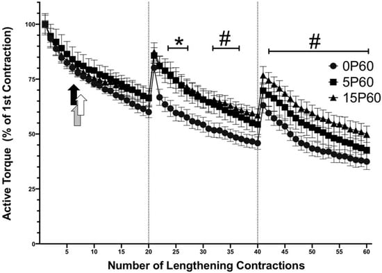 Preconditioning with 15 LC demonstrated an RBE on active torque. Both 5P60 and 15P60 sustained greater active torque for a few contractions in the second set, relative to 0P60 * p < 0.05. The 15P60 group retained greater active torque values throughout the second and third sets, relative to 0P60 # p < 0.05. The commencement of in-group drops in active torque relative to the first contraction are represented by the black, white, and gray arrows in the 0P60, 5P60, and 15P60 groups, respectively (p < 0.05). Values are expressed as mean ± SEM.