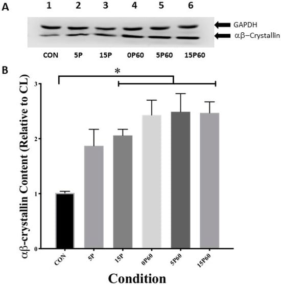 Preconditioning with 15 LC increased skeletal muscle αB-crystallin content similar to that of 60 LC. (A) Western blot analysis of αB-crystallin and GAPDH content for each condition. (B) The 15P, 0P60, 5P60, and 15P60 demonstrated elevated αB-crystallin content relative to CON * p < 0.05, whereas 5P had no effect on αB-crystallin content. Values are expressed as mean ± SEM.