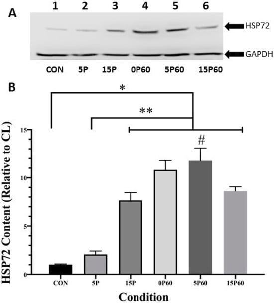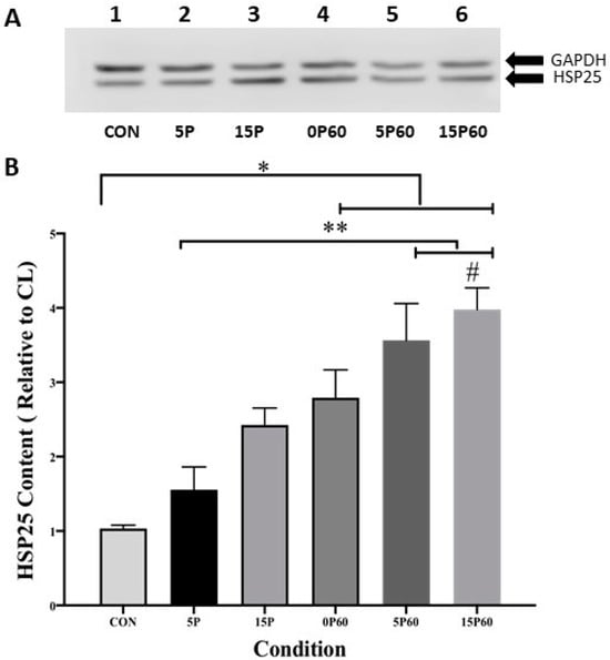 HSP25 content increased in proportion to the number of LC. (A) Western blot analysis of HSP25 and GAPDH content in each condition. (B) The 15P, 0P60, 5P60, and 15P60 all significantly elevated HSP25 content relative to CON * p < 0.05. Additionally, 5P60 and 15P60 significantly elevated HSP25 content compared to 5P ** p < 0.01 and 15P60 HSP25 content was significantly higher than that in 15P # p < 0.05. Values are expressed as mean ± SEM.