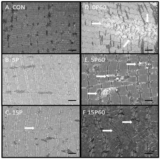 Both preconditioning treatments appeared to reduce morphological disruptions in the sarcomeres. Upon visual inspection, the CON (A) and 5P (B) appeared to have no notable change in sarcomere organization or changes to integrity. The 15P (C) appeared to provide some evidence for Z-disk streaming. Following 60 LC, the 0P60 (D) demonstrated the greatest evidence of sarcomeric disintegration and discontinuity, whereas the 5P60 (E) and 15P60 (F) each showed localized evidence of damage indicated by the white arrows. Scale indicates 2 μm.
