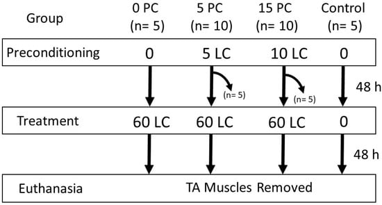 Thirty male Sprague–Dawley rats (387.1 to 491.1 g) were obtained from Charles River Laboratories (Montreal, QC, Canada), housed 2/cage, provided food and water ad libitum, and were maintained on a constant 12 h light/dark cycle. Experimental procedures were approved by the Animal Care Committee at the University of Toronto and were in accordance with Guidelines for the Canadian Council on Animal Care (July, 2023:AUP #20012987). Rats were divided into 4 main groups (Figure 9): a control group (n = 5) that received no LC, a group (n = 5) with no preconditioning and subjected to 60 LC (0P60), a group (n = 10) treated with 5 preconditioning LC prior to 60 LC (5P60), and a group (n = 10) treated with 15 preconditioning LC prior to 60 LC (15P60). To examine the muscle HSP content following preconditioning, five of the ten animals in each of the preconditioning groups (5 and 15 LC) were euthanized 48 h following PC and were not treated with 60 LC. Forty-eight hours after the last contraction, all animals were euthanized, and the TA muscles were removed and processed for HSP content and morphological assessment. A schematic outlining of the animals and procedures is shown in Figure 9.