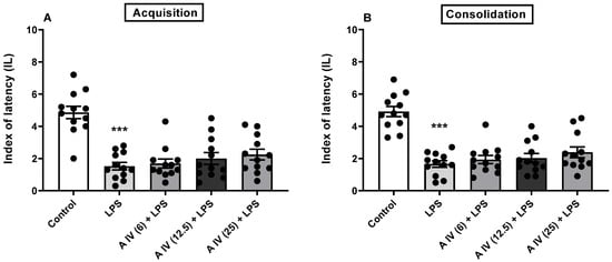 Effect of astragaloside IV (6, 12.5 or 25 mg/kg, ip) on the acquisition (A) and consolidation (B) of long-term memory impairment induced by LPS (2.5 mg/kg, ip) administration in mice. Data are presented as individual measurements, mean ± SEM (n = 12 per group). *** p < 0.001 compared to control. LPS—lipopolysaccharide.