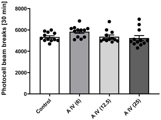 Effect of astragaloside IV (6, 12.5 or 25 mg/kg, ip) on locomotor activity. Data are presented as individual measurements, mean ± SEM. Locomotor activity was measured by interrupting the light beam of the photocell for 30 min (n = 12 per group).