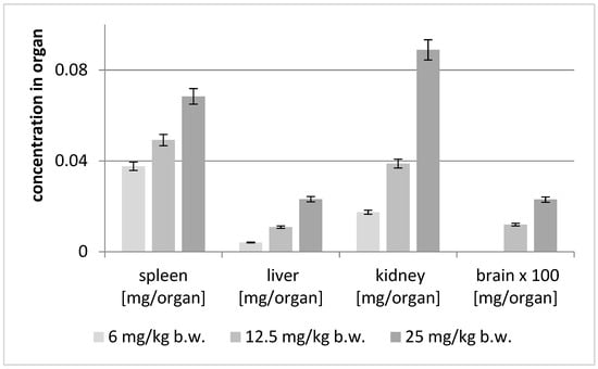 The concentration of astragaloside IV in soft organ tissues was dose-dependent (see Figure 4). Interestingly, the highest content of the saponin was found in the kidneys, then in the spleen, liver and brain. At the dose of 25 mg/kg, the greatest concentration of the substance was observed in the kidneys, while at the lower doses the greatest concentration was found in the spleen.