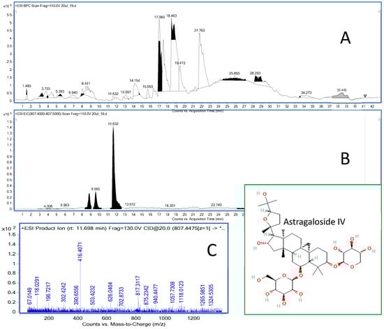 The total ion chromatogram of the liver extract recorded in positive ionization mode (A) together with the extracted ion chromatogram of astragaloside IV (11.6 min) (B) and the MS/MS chromatogram of the compound (C).