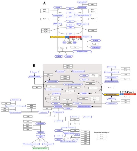 Effect of astragaloside IV treatment (25 mg/kg b.w. ip) on the levels of phosphatidylcholines as metabolic markers in the brains of mice involved in Kennedy metabolism (A) and one-carbon metabolism (B), expressed by log2 values compared to control groups (samples 1–8: see Table 3).