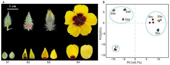 Wang, H.; Kong, Y.; Dou, X.; Yang, Y.; Chi, X.; Lang, L.; Zhang, Q.; Pan, H.; Bai, J. Integrative Metabolomic and Transcriptomic Analyses Reveal the Mechanism of Petal Blotch Formation in Rosa persica. Int. J. Mol. Sci. 2024, 25, 4030. https://doi.org/10.3390/ijms25074030