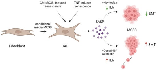 Bogdanova DA, Kolosova ED, Pukhalskaia TV, Levchuk KA, Demidov ON, Belotserkovskaya EV. The Differential Effect of Senolytics on SASP Cytokine Secretion and Regulation of EMT by CAFs. International Journal of Molecular Sciences. 2024; 25(7):4031. https://doi.org/10.3390/ijms25074031