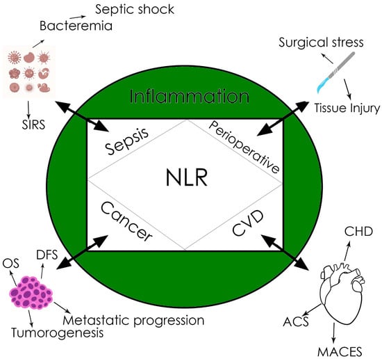 NLR’s clinical implications. CVD, cardiovascular disease. CHD, coronary heart disease. ACS, acute coronary syndrome. MACEs, major adverse cardiac events. DFS, disease-free survival. OS, overall survival. SIRS, systemic inflammatory response syndrome.