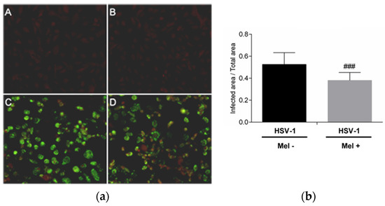 HSV-1 antigen detection by immunofluorescence in Vero cells. (a): Photomicrographs of sections of Vero cells taken from (A) Control, (B) Control + Mel (1 mM) (C) HSV-1, (D) HSV-1 + Mel (1 mM). Original magnification: 200×. (b): Image analysis of the area of antigen staining performed using the ImageJ software v3.91. Values are expressed as means (n = 10). ### p < 0.001 (HSV-1/HSV-1+Mel).