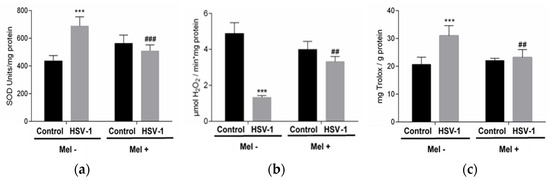 Effect of HSV-1 infection and melatonin treatment on antioxidant enzyme activity and total antioxidant activity. (a) Superoxide dismutase activity, (b) catalase activity and (c) total antioxidant activity. Values are expressed as means ± SEM (n = 6). *** p < 0.001, (Control/HSV-1), ### p < 0.001, (HSV-1/HSV-1+Mel), ## p < 0.01 (HSV/HSV-1+Mel).