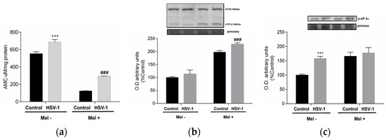 Effect of HSV-1 infection and melatonin treatment on proteasome and unfolded protein response (UPR). (a) Proteasome activity, (b) ratio ATF6-α 50/90 kDa expression and (c) p-eiF2-α expression. Values are expressed as means ± SEM (n = 6). *** p < 0.001, (Control/HSV-1), ### p < 0.001, (HSV/HSV-1+Mel).