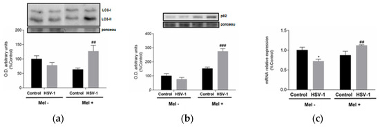 Effect of HSV-1 infection and melatonin treatment on autophagic response. (a) LC3-II/LC3-I ratio, (b) p62 protein expression and (c) LAMP-2A gene expression. Values are expressed as means ± SEM (n = 6). ## p < 0.01, (HSV-1/HSV-1+Mel), ### p < 0.001, (HSV-1/HSV-1+Mel), * p < 0.05, (Control/HSV-1).