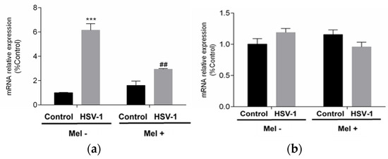 Effect of HSV-1 infection and melatonin treatment on apoptotic response. (a) BAX gene expression and (b) BCL-2 gene expression. Values are expressed as means ± SEM (n = 6). *** p < 0.001, (Control/HSV-1), ## p < 0.01, (HSV-1/HSV-1+Mel).