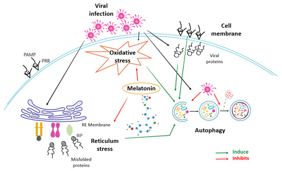 Infection with herpes simplex virus type 1 (HSV-1) is typically characterized by three distinct phases that correspond to the clinical course experienced by most patients: acute infection, latency, and reactivation. In most cases, acute infection occurs during early childhood and is often asymptomatic or may present with only mild symptoms such as fever and rash. During primary infection, viruses are transported via sensory ganglia to establish a chronic latent infection, most commonly in the trigeminal, cervical, or lumbosacral ganglia. Clinically evident reactivation, often in the setting of immune compromise, can be associated with different pathologies such as cold sores, herpes stromal keratitis, eczema herpeticum, meningitis and herpes simplex encephalitis [1]. The majority of anti-HSV drugs are nucleoside analogues such as acyclovir and penciclovir that directly target the viral DNA polymerase when in their phosphorylated form. Since the first phosphorylation of antiviral nucleoside analogues typically occurs via the viral enzyme thymidine kinase (TK), the main basis for resistance resides in mutations in this viral enzyme. One way to overcome this requirement for TK is to use a nucleotide analogy that already has a monophosphate attached, like cidofovirand adefovir or a non-nucleotide analogue such as foscarnet [2]. In any case, acyclovir is the most used antiherpetic and the prevalence of acyclovir-resistant isolates among immunocompetent and immunocompromised hosts has been reported at approximately 0.3–5% and 4–7%, respectively [3]. Gaining knowledge of the cellular mechanisms that the virus alters could provide interesting avenues to detect targets and design new antiviral strategies. The absence of viral machinery for protein synthesis, which makes the virus completely dependent on cellular machinery for the production of its own proteins, makes the endoplasmic reticulum, as the cell’s main protein producer, a prime candidate for study. Thus, the new viral demand for proteins will induce an excess of endoplasmic request that will result in an overproduction of misfolded proteins known as endoplasmic reticulum stress [4], which usually exceeds the capacity of the proteasome. To try to counteract this stress, the cell develops its multifactorial misfolded protein response system (known as unfolded protein response, UPR), which triggers consecutive response cascades depending on the severity of the induced stress [5] and may ultimately induce the activation of survival mechanisms, such as autophagy or programmed cell death or apoptosis. Melatonin (N-acetyl-5-methoxytryptamine) is a highly conserved multifunctional signalling molecule. On the one hand, melatonin is a hormone secreted in circadian rhythm by the pineal gland, with a systemic light/dark information function (low daytime levels and nocturnal peak) [6]. However, this indolamine is also produced at constant levels in most cells of the organism, acting as a potent antioxidant and inducer of antioxidant enzymes, and modulator of endoplasmic reticulum stress, as well as regulator of apoptosis and autophagy. These functions may explain its role in various biological processes [7,8]. Indeed, numerous clinical trials have examined the therapeutic usefulness of melatonin in preventing cell damage in both acute (sepsis, asphyxia in newborns) [9] and chronic (metabolic and neurodegenerative diseases, cancer, inflammation, aging) states [10]. Their role has been also studied in infections, especially in those caused by viruses, which often result in increased oxidative stress and inflammatory injury [11]. In fact, some evidence of the ability of melatonin to protect against viral infections has been reported. Encephalomyocarditis virus (EMCV) is a highly virulent and aggressive pathogen that triggers inflammation in the brain and heart of rodents. When mice were infected with non-lethal doses of EMCV, the administration of melatonin prevented paralysis and fatalities [12]. Melatonin also demonstrates protective properties in mice infected with Semliki Forest virus (SFV), an arbovirus known for causing encephalitis by infiltrating the central nervous system (CNS) and eventually leading to death. Injected melatonin not only decreased mortality rates but also significantly delayed the onset of symptoms and eventual death [13]. Despite the fact that attenuated West Nile virus (WN-25) is not neuroinvasive and does not typically induce encephalitis, exposure to stressors can trigger WN-25 encephalitis in mice. Melatonin can counteract the immunosuppressive effects of stress exposure, thereby preventing stress-induced encephalitis and mortality in WN-25-infected mice [13]. Venezuelan equine encephalomyelitis (VEE) is a significant disease affecting both humans and horses, caused by the VEE virus (VEEV), which is transmitted by mosquitoes. Outbreaks have occurred in northern South America from the 1920s to the 1970s, affecting thousands of individuals and equids. Mice serve as an experimental model, displaying agitation and increased movement followed by decreased mobility, paralysis, unconsciousness, and death upon VEE virus infection. Administration of melatonin protects VEE virus-infected mice by reducing virus levels in the brain and bloodstream, lowering mortality rates, delaying symptom onset, and extending survival time. Additionally, surviving mice treated with melatonin exhibit markedly elevated levels of VEE virus IgM antibodies [14]. Aleutian mink disease results from persistent infection with the Aleutian mink disease virus (AMDV). Minks in the advanced stages of the disease exhibit elevated levels of gamma globulins due to high concentrations of non-neutralizing AMDV antibodies, which are believed to cause lesions in the kidneys, liver, lungs, and arteries. Implants containing melatonin have been shown to decrease mortality in AMDV-infected minks [15]. All these data support a protector effect of melatonin against vi