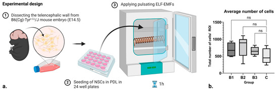 (a) Scheme of the experimental design and setup. (b) Box and whisker plot showing the number of cells within each respective control and treatment group, where B1 = 1.21–7.26 mT, B2 = 7.26–13.31 mT, and B3 = 13.31–18.15 mT. Here, ROI stands for “Region of Interest”, while ns denotes “non significance”. Created with BioRender.com (accessed on 7 February 2024).