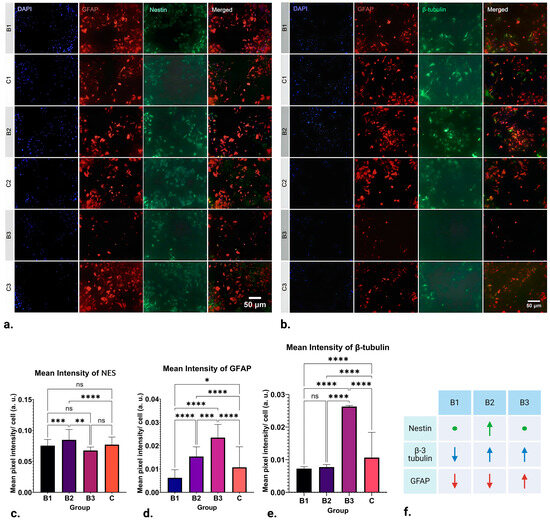Interestingly, NES immunoreactivity of NSCs was mostly unaltered post-treatment application, with an exception in group B2 (7.26–13.31 mT), where upregulation in the marker’s expression was visible (p ≤ 0.0001) (Figure 2c).