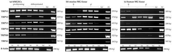 The gene expression of TRPV1, -2, -3 and -4, TRPM8 and TRPA1 was analyzed using RT-PCR in human (three males, three females) and murine (three males, three females) MGs, as well as in immortalized human meibomian gland epithelial cells (hMGECs) (Figure 1). RT-PCR analysis showed the gene expression of TRPV1 (285 bp), TRPV2 (228 bp), TRPV3 (288 bp), TRPV4 (379 bp) and TRPM8 (621 bp) in three samples of both proliferating and differentiated hMGEC cultures (Figure 1a). No gene expression could be detected for TRPA1 in hMGECs. The semi-quantitative analysis for the TRPM8 PCR signal was much stronger in the proliferating hMGECs than it was in the differentiated hMGECs. RT-PCRs with murine MG tissue (Figure 1b) showed a much stronger signal for TRPV1 (239 bp) in the male mice than in the female mice. For TRPV2 (174 bp), TRPV3 (623 bp) and TRPV4 (221 bp), the PCRs showed products with comparable signal strengths for all the samples. The PCR for TRPM8 (525 bp) yielded only one signal for one of the female mice, but no signals in the male mice. Our RT-PCR results showed no gene expression of TRPA1 (393 bp) in any of the analyzed murine MGs. The RT-PCR in human MG tissue in three samples of both female and male tissue showed a comparatively weak signal for TRPV1 in the female samples, while only one of the male samples showed any signal at all. TRPV2 yielded strong signals in all but one female sample, while TRPV3 only showed weak results in all female samples. The signal in the female samples for TRPV4 was stronger than the one in the male samples. Notably, TRPM8 showed signals for only two samples, one female and one male, and there was no sign of TRPA1 gene expression (Figure 1c). A ß-actin PCR was performed for every utilized cDNA and yielded strong signals for all the samples.