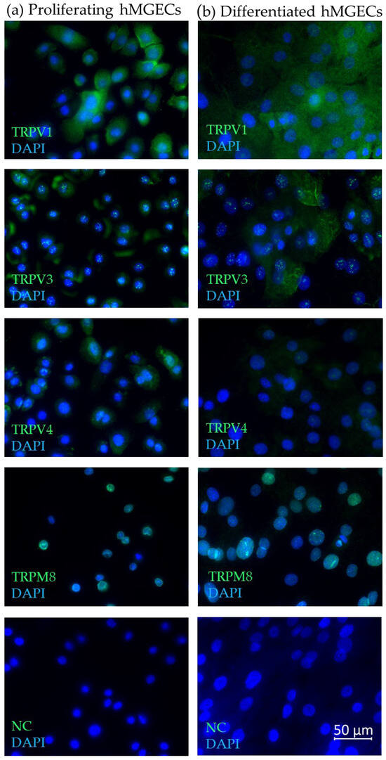 Immunofluorescence results show the expression of TRPV1, TRPV3, TRPV4 and TRPM8 in hMGECs. (a) Proliferating hMGECs, (b) differentiated hMGECs. The fluorescence microscopic images show an overlay of both the respective antibody (green) and DAPI (blue) signal. All microscopic images are presented in ×600 magnification.