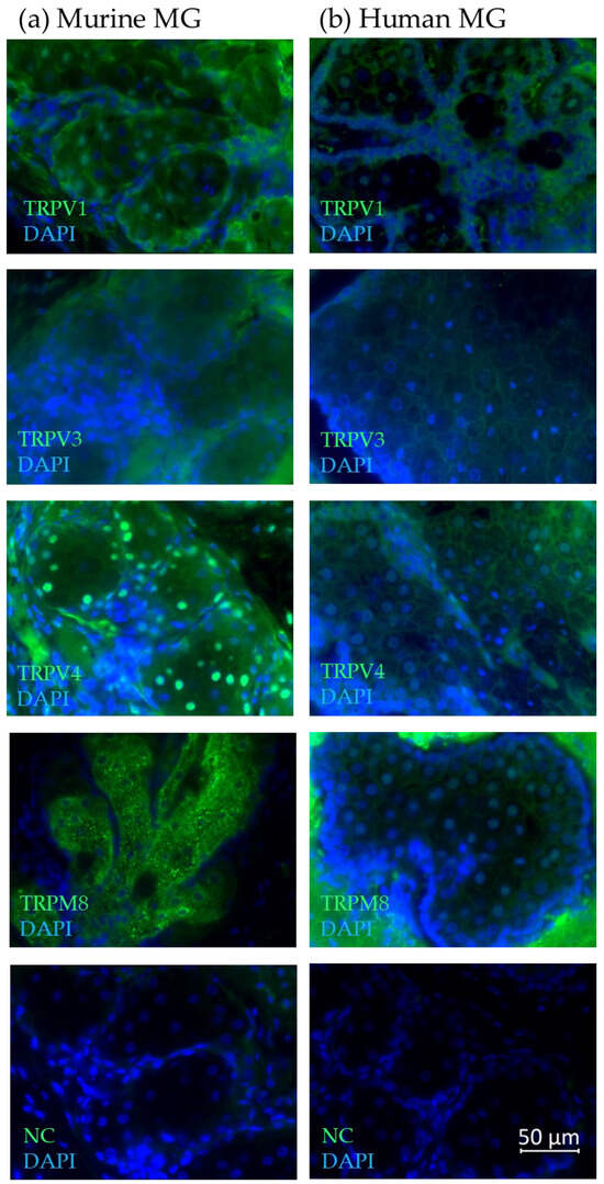 Immunofluorescence with antibodies for TRPV1, TRPV3, TRPV4 and TRPM8 confirmed their expression at the protein level and revealed cell- and tissue-specific reactivity in proliferating and differentiated hMGECs (Figure 3a,b), as well as human (Figure 4a) and murine (Figure 4b) MGs obtained from eyelids. The green fluorescence signal corresponds to the cellular- or tissue-specific localization of the corresponding thermo-TRP channel in the examined cells or MG tissues. The blue signal shows the DAPI co-staining against the cell nucleus. In detail, the green fluorescence signal for TRPV1 in both the proliferating and differentiated hMGECs could be located around the cell nucleus in the cytoplasm, with stronger intensity close to the cell membrane in the proliferating hMGECs. The antibody signal for TRPV3 in the proliferating hMGECs could be seen at the edge of the cell, close to the cell membrane and sometimes surrounding the cell nucleus, while in the differentiated hMGECs it stained the cytoplasm, filling the whole cell. Inside the cell nucleus, the antibody signal formed spots of very strong intensity. In the proliferating hMGECs, the signal for TRPV4 was located around the cell nucleus, while the signal in the differentiated hMGECs was much weaker. The TRPM8 signal was limited to the nuclei in both the proliferating and differentiated hMGECs, and no signal could be seen in the cytoplasm or membrane. As expected, the negative controls did not show any specific antibody reaction at the same exposure time.