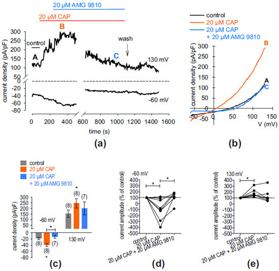 The characteristics of cells are dependent on calcium-dependent cellular mechanisms. Intracellular calcium is substantially regulated via TRPs. Therefore, in this set of experiments, whole-cell currents were measured after the application of CAP (20 µM) with and without the specific TRPV1 blocker AMG9820 (10 µM) for the identification of functional TRPV1 channels in cultivated hMGECs. Similarly, 20 µM icilin was added with or without the specific TRPM8 blocker AMTB (10 µM) for TRPM8 identification. Figure 5a shows that an extracellular application of 20 µM CAP led to an increase in whole-cell out- and inward currents. Specifically, the latter increased from −18.31 ± 3.45 pA/pF (control) to −39.29 ± 4.31 pA/pF (both n = 8; * p < 0.05) (Figure 5c). This current increase could be suppressed in the presence of 10 µM AMTB to 13.03 ± 4.35 pA/pF) (* p < 0.05; n = 7) (Figure 5c). Figure 5b shows the current voltage relationship of whole-cell currents in control conditions (black trace) and in the presence of 20 µM CAP without AMG9810 (orange trace) and with AMG9810 (20 µM) (blue trace). Figure 5d,e show normalized current amplitudes (% of control) of CAP-increased inward- and outward currents with and without AMG9810. In the presence of CAP, the inward currents increased from 100% (set as control) to −93 ± 64% (n = 8; * p < 0.05). In the presence of 20 µM AMG9810, these currents decreased to 110 ± 35% (n = 7; * p < 0.05). Similar results could be registered concerning the outward currents (n = 8; * p < 0.05). However, an inhibitory effect could not be detected in every cell and did not reach statistical significance.