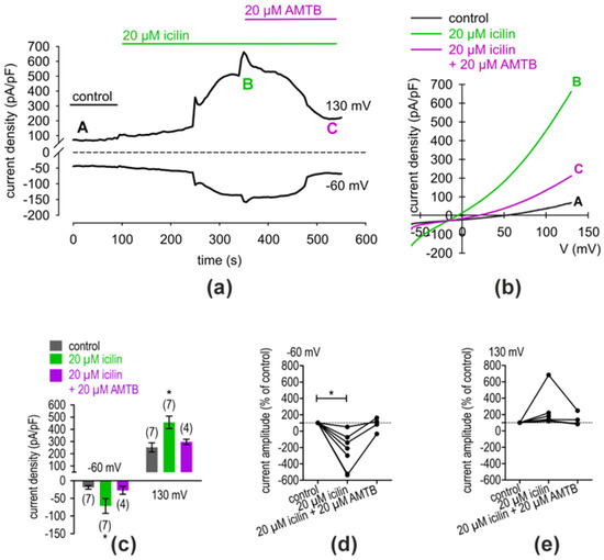Similar experiments were carried out regarding the identification of functional TRPM8 expression, which are summarized in Figure 6. Figure 6a shows the time course of the experiment whereas Figure 6b shows the corresponding current voltage relationship at the time points marked with the capitalized letters. At this point, icilin and AMTB were used (both 20 µM). As a result, icilin increased the whole-cell inward currents from −18.83 ± 5.02 pA/pF (control; n = 7) to −71.54 ± 20.82 pA/pF (* p < 0.05; n = 8) (Figure 6c). Similar results could be registered concerning the outward currents (n = 7; * p < 0.05) (Figure 6c). An inhibitory effect could be observed but did not reach statistical significance. Figure 6d,e summarize an analysis at which the control currents were set to 100%. After the application of 20 µM icilin, the inward currents increased from 100% to −248 ± 84 % of the controls (n = 7; * p < 0.05). In summary, the patch-clamp data analyses indicated that TRPV1 and TRPM8 are functionally expressed in hMGECs.