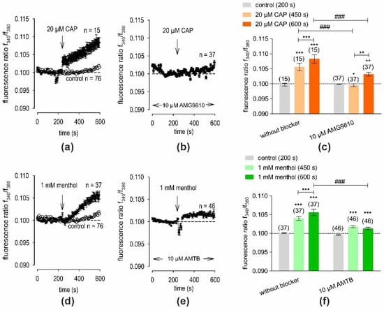 The same experimental design was used to assess TRPM8 function in hMGECs. This time, the effect of the selective TRPM8 agonist, menthol (1 mM), on [Ca2+]i levels was measured. Before applying 1 mM menthol, baseline measurements were conducted which had an f340 nm/f380 nm ratio of 0.1001 ± 0.0001, with n = 37 at 200 s. Subsequently, the extracellular application of 1 mM menthol led to an increase in the f340 nm/f380 nm ratio to 0.1056 ± 0.0009 at t = 600 s (n = 37, *** p < 0.001), indicating an overall increase in the [Ca2+]i concentration (Figure 7d). As with the CAP experiments, a negative control experiment was conducted in the presence of the selective TRPM8 antagonist AMTB (10 µM). As shown in Figure 7e, the increase in [Ca2+]i was clearly suppressed by 10 µM AMTB. Accordingly, the f340 nm/f380 nm ratio decreased to 0.1013 ± 0.0004 at t = 600 s (n = 46, ### p < 0.001). The results of the two-test series are summarized in Figure 7f. Therefore, the functional expression of TRPM8 in hMGECs was suggested, as shown by the intracellular Ca2+ analysis using menthol and AMTB. Taken together, TRPV1 and TRPM8 channels in hMGECs could be detected for the first time.