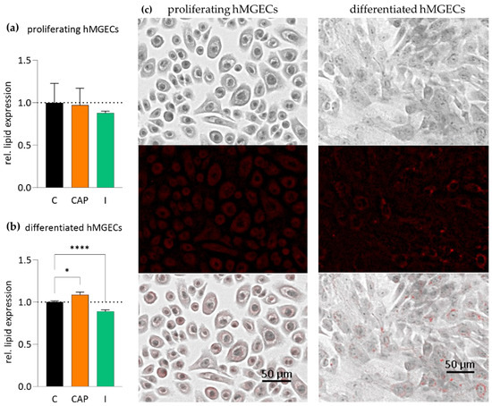 Results of oil red O staining (ORO) after TRPV1 and TRPM8 stimulation in proliferating and differentiated hMGECs. hMGECs were stimulated for 24 h with CAP (10 µM) or icilin (I, 100 µM). The lipid accumulation in the cells was stained with ORO, documented photographically and analyzed using ImageJ software (version 1.54 h). The bars represent the ratio of the lipid accumulation compared to untreated controls. (a) In the proliferating hMGECs, CAP and icilin showed no significant impact on lipid accumulation after 24 h. (b) In the differentiated hMGECs, there was a significant increase in lipid content after TRPV1 activation and a decrease after TRPM8 activation. (c) Representative images of the experiments summarized in (a,b). The pictures show the stained proliferating and differentiated hMGECs in ×600 magnification, the bright field image, the ORO staining (red) and an overlay of both pictures. Asterisks (* p < 0.05, **** p < 0.0001; unpaired, ordinary one-way ANOVA test indicates statistically significant results for the stimulation of TRPV1 and TRPM8).