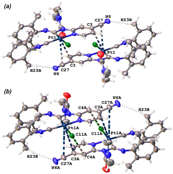 In both structures (3 and 3·2MeCN), the molecules of the metal complex are associated into supramolecular dimers via stacking interactions between two metal square-planes (each of which includes the 4-cyanopyridine moiety and the Pt(II)-based metallocycle, Figure 2 and Figure S1, Table 1 and Table 2), with additional supporting by several hydrogen bonds. In the structure of 3, conformers 3A and 3B form two types of dimers ({3A}2 (Figure 2a) and {3B}2) (Figure 2b), in which the carbamoyl moieties are oriented relative to each other, like “C=O to C=O” ({3A}2) and like “CH3 to CH3” ({3B}2). In dimer {3A}2, the molecules of the metal complex are located much closer to each other in comparison with {3B}2. Particularly in {3A}2, the shortest interplanar distance is the distance between two pyridine rings (3.479(3) Å; the shortest C···C contact is 3.386(5) Å; Table 1) and it has an appropriate value for typical π···π stacking (3.41–3.61 Å) [,]. In contrast, in {3B}2, the metal square-planes are more parallel displaced in comparison with {3A}2, which is illustrated by the “r” value (the distance between the centroid of one of the ring and the projection of the centroid of a π···π stacked ring to the first plane, Table 1). They are 0.948(5) Å and 1.805(6) Å for {3A}2 and {3B}2, respectively. The interplanar distance in {3B}2 is significantly larger (3.987(3) Å) than in {3A}2. The shortest C···C contact in {3B}2 is 3.613(6) Å, which is at the end of the range of typical π···π stacking interactions (3.41–3.61 Å) [,]. According to our observation, this difference is caused by the steric repulsion of two methyl groups of the carbomoyl moieties facing each other in the case of the dimer {3B}2.