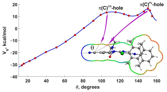 Dependence of the MEP value vs. angle θ for 3A (0.001 a.u. isosurface of the electron density). The MEP plot is shown around the molecule in the plane passing through the CN atoms and the middle point of the C–C bond of the pyridine cycle (blue–green–red color scale −30 < Vs < 36 kcal mol−1).