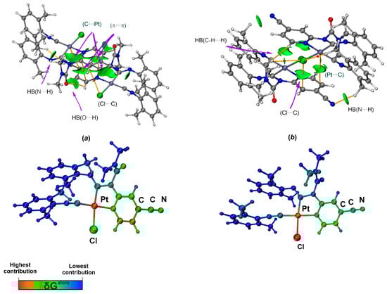 For the IGMH isosurface (Figure 5b) of the [3B]2 dimer, green disk-shaped surfaces were found between the atoms (Pt or Cl) and C atom, confirming the presence of C···Cl and C···Pt contacts. However, the Cl atom dominates in dimer bonding, as evidenced by the δGatom contribution distribution scheme. The presence of HB in the dimer structure is also confirmed by the IGMH method.