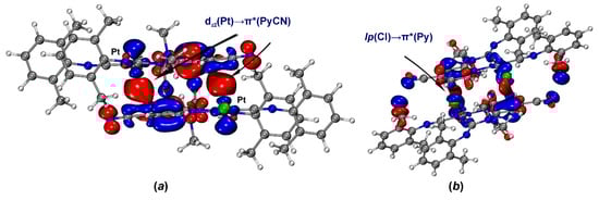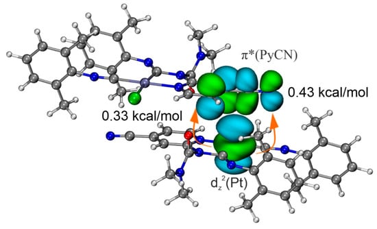 Second-order perturbation theory (E2), based on NBO analysis, also reveals the presence of dz2(Pt)→π*(PyCN) CT. NBO analysis shows that the direct CT in the C···Pt contact is associated with lone pair transitions from dz2(Pt) to π*-orbital of PyCN moiety with total second-order perturbation energies E(2) −0.76 kcal/mol (Figure 8). Thus, the dz2(Pt)→π*(PyCN) CT is an important component of the studied C···dz2(Pt) interaction, and, therefore, this noncovalent contact should be attributed to TtB.
