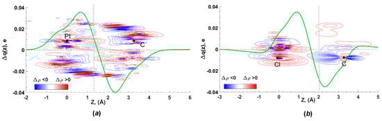 Total EDD contour plot (red—charge concentration, blue—charge depletion, range—0.01 to 0.04 a.u., step 0.0002 a.u.) and CDF functions for the C···dz2(Pt) interaction in [3A]2 (a) and the C···lp(Cl) interaction in [3B]2 (b); black dots indicate positions of the atomic nuclei, grey vertical lines identify the boundaries between the C, Pt, and Cl atoms, which are placed along the z axis.